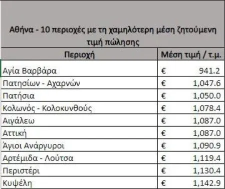 Συγκεκριμένα η Αγία Βάρβαρα καταγράφεται ως η πιο φτηνή περιοχή για να αγοράσει κάποιος ακίνητο με μια μέση τιμή να μην ξεπερνά τα 1.000 ευρώ το τ.μ. (941 ευρώ το 2020), για ανακατασκευασμένα σπίτια, κι ακολουθούν Πατησίων – Αχαρνών με 1.047 ευρώ το τ.μ. το 2020 και μικρή άνοδο το 2021 (1077 ευρώ το τ.μ.).
