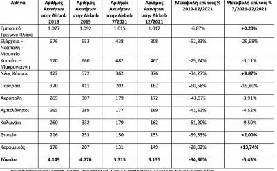 Σύμφωνα με τα τελευταία στοιχεία της AirDNA η μείωση των εγγεγραμμένων ακινήτων (ολόκληρα διαμερίσματα ή/και κατοικίες) στην πλατφόρμα βραχυχρόνιας μίσθωσης Airbnb στις top περιοχές του κέντρου αγγίζει το 34,36% με το σύνολο των εγγεγραμμένων ακινήτων να αριθμούν τα 3.135 όταν το 2019 ήταν 4.776 στις λεγόμενες top περιοχές.