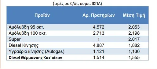 Σύμφωνα με τα στοιχεία που δίνει το Παρατηρητήριο των τιμών των υγρών καυσίμων στην Ελλάδα, η μέση τιμή της 95άρας αμόλυβδης στην Ελλάδα είναι 2,05 ευρώ το λίτρο, η 100άρα κοστίζει κατά μ.ο 2,19 ευρώ το λίτρο, ενώ το diesel βρίσκεται στο 1,8 ευρώ το λίτρο.