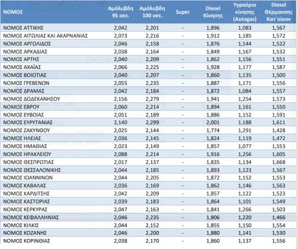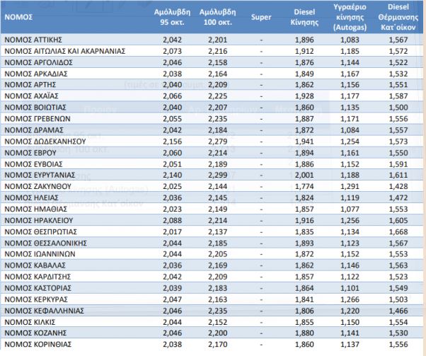 Πάντως, ήδη σε νομούς όπως οι Κυκλάδες (2,202) και τα Δωδεκάνησα (2,156) άλλωστε, η 95άρα βενζίνη έχει ξεπεράσει εδώ και βδομάδες τα 2 ευρώ/λίτρο.