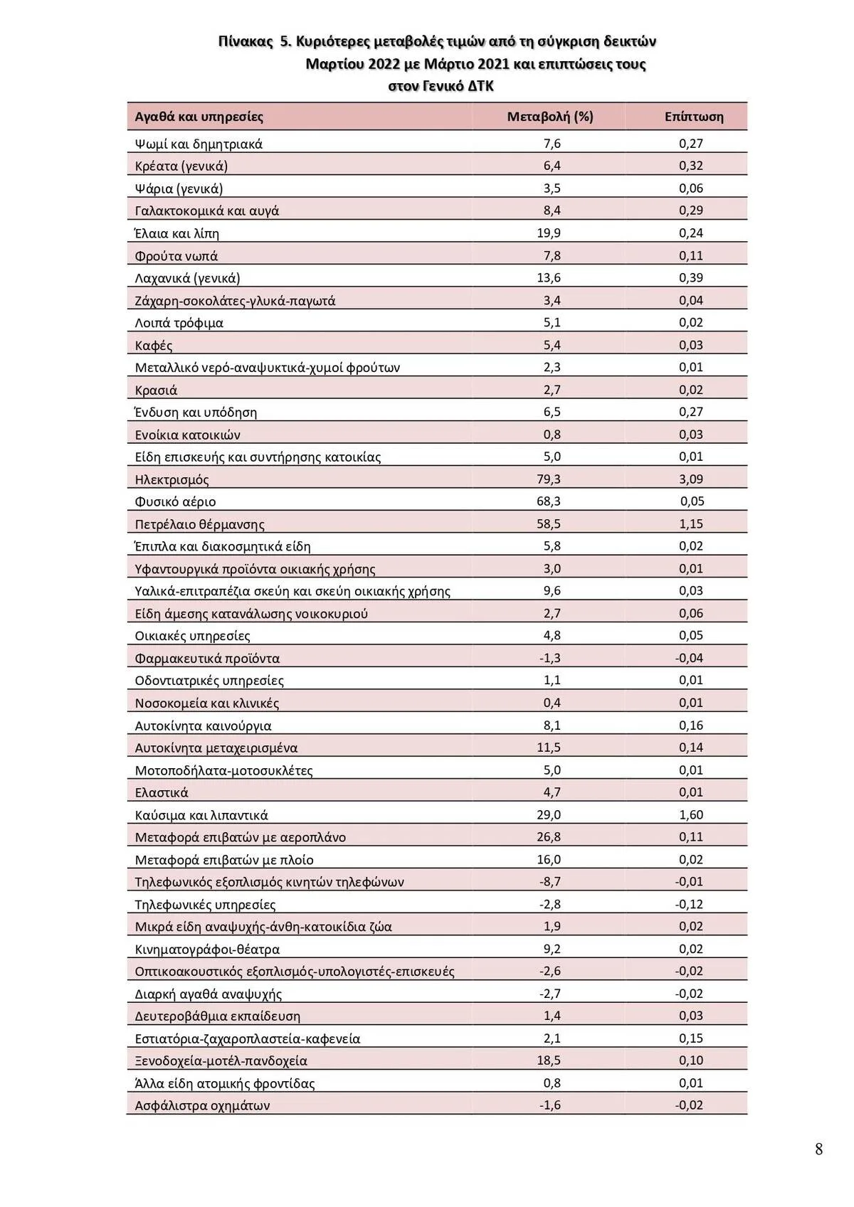 Σύμφωνα με την Ελληνική Στατιστική Αρχή, από τη σύγκριση του Γενικού Δείκτη Τιμών Καταναλωτή του μηνός Μαρτίου 2022 με τον αντίστοιχο Δείκτη του Μαρτίου 2021 προέκυψε αύξηση 8,9%, έναντι μείωσης 1,6% που σημειώθηκε κατά την αντίστοιχη σύγκριση του έτους 2021 με το 2020.