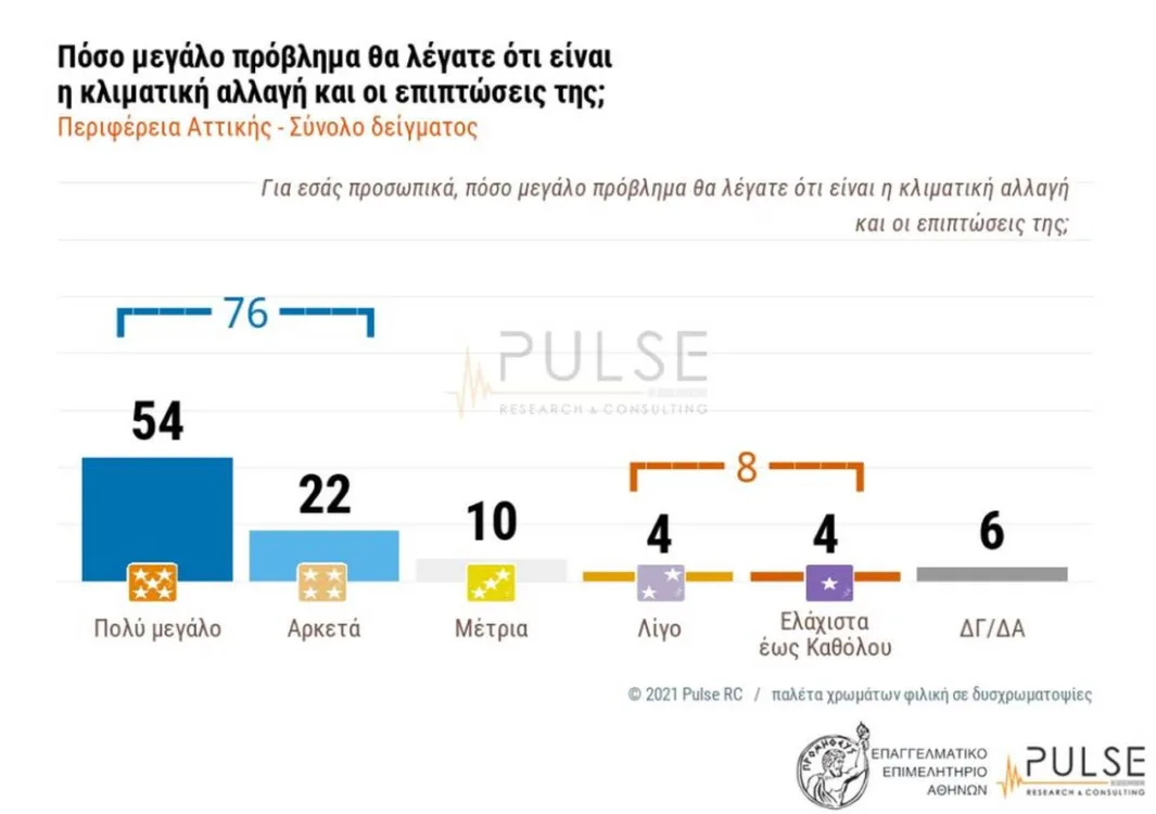 Ανησυχία, τέλος, καταγράφεται και για το πρόβλημα της κλιματικής αλλαγής και τις επιπτώσεις του στο περιβάλλον, στην οικονομία και σε ανθρώπινες ζωές (το 70% των αυτοαπασχολούμενων, το 76% του γενικού πληθυσμού, το αξιολογούν ως ένα, αρκετά έως πολύ, μεγάλο πρόβλημα).