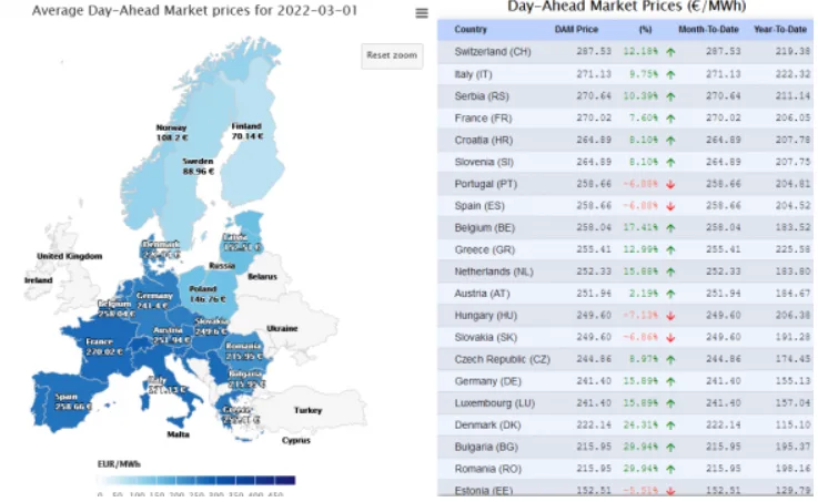 Στο ίδιο μοτίβο μπήκε και ο Μάρτιος, με τις χονδρεμπορικές αγορές ηλεκτρικής ενέργειας της Ευρώπης να καταγράφουν σημαντικές αυξήσεις. Οι χώρες που βρίσκονται στις πρώτες θέσεις για σήμερα είναι η Ελβετία με 287,5€/MWh, η Ιταλία με 271,1€/MWh, η Σερβία με 270,6€/MWh και η Γαλλία με 270€/MWh.Με εξαίρεση την Πολωνία, καμία χώρα δεν κινείται κάτω από τα 215 ευρώ ανά Μεγαβατώρα, ενώ η χώρα μας καταγράφει αύξηση 13%, με συνέπεια η ελληνική αγορά Επόμενης Ημέρας να αγγίζει σήμερα τα 255,4 ευρώ ανά Μεγαβατώρα.