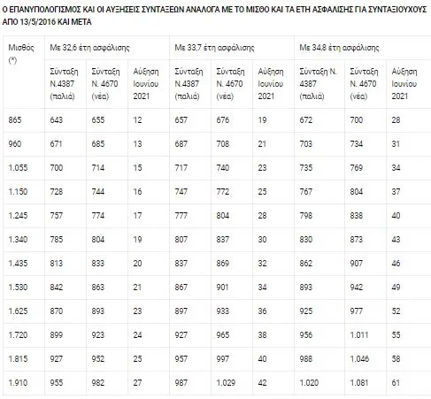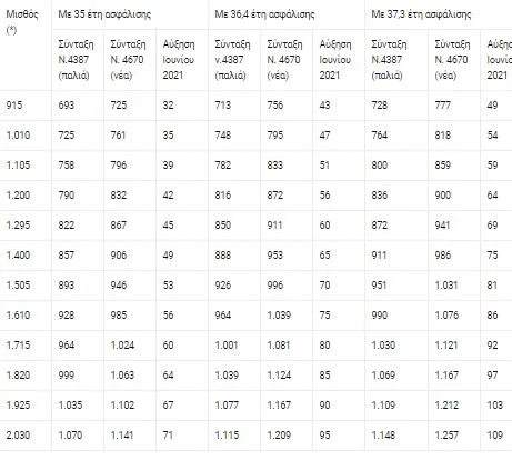 Οι μικτές αυξήσεις συντάξεων που προκύπτουν ανάλογα με έτη-μήνες ασφάλισης για μισθούς από 865 ευρώ ως 2.650 ευρώ έχουν ως εξής: