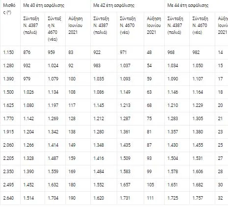 Σύμφωνα με τους πίνακες, οι συνταξιούχοι με 42 έτη ασφάλισης θα έχουν αυξήσεις από 48 ευρώ το μήνα ως 111 ευρώ το μήνα, ενώ με 44 έτη οι αυξήσεις θα είναι μικρότερες, και θα κυμανθούν μεταξύ 14 και 32 ευρώ το μήνα.