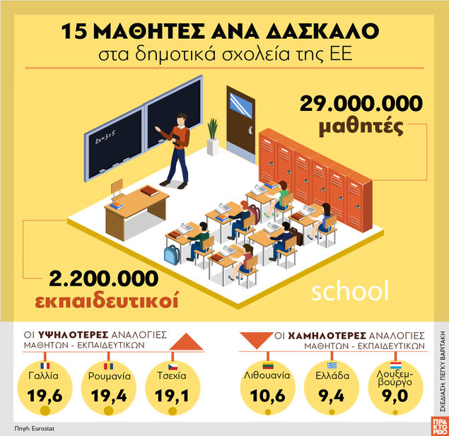 Οι υψηλότερες αναλογίες μαθητών-εκπαιδευτικών αναφέρθηκαν στη Γαλλία (19,6), στη Ρουμανία (19,4) και στην Τσεχία (19,1). Στο άλλο άκρο της κλίμακας, οι χαμηλότερες αναλογίες καταγράφηκαν στο Λουξεμβούργο (9,0), στην Ελλάδα (9,4) και στη Λιθουανία (10,6).