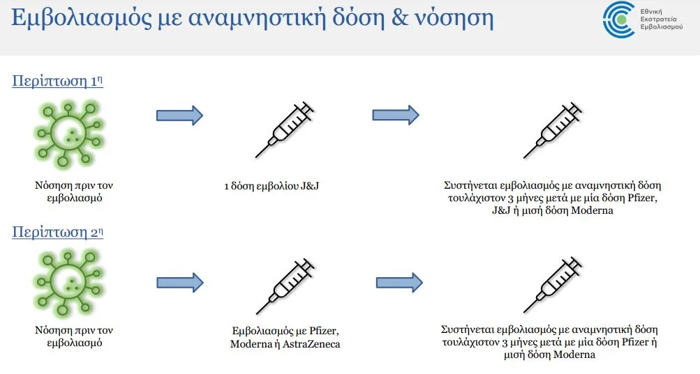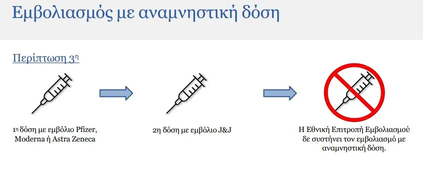 Για τα άτομα που έχουνε ολοκληρώσει τον εμβολιασμό τους με εμβόλιο Johnson & Johnson, η αναμνηστική δόση θα πραγματοποιείται με το εμβόλιο της Johnson & Johnson, Pfizer ή μισή δόση Moderna εμβόλιο, μετά από 2 μήνες.