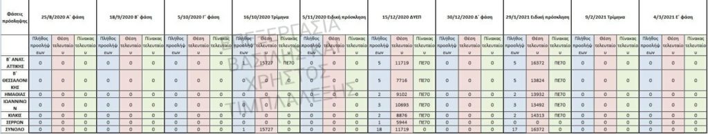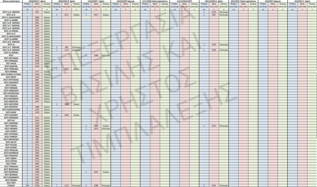Πλήθος προσλήψεων, θέση και πίνακας τελευταίου ανά περιοχή για όλες τις ειδικότητες σε όλες τις φάσεις πρόσληψης: