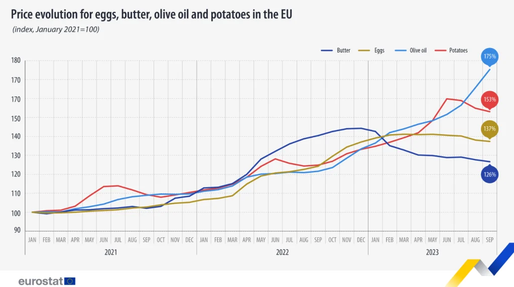 Αναλυτικότερα, τον Σεπτέμβριο του 2023, οι τιμές των αυγών, του βουτύρου και της πατάτας στην ΕΕ είναι υψηλότερες από τον Ιανουάριο του 2021 και του 2022, ενώ οι τιμές του ελαιόλαδου αυξάνονται συνεχώς.