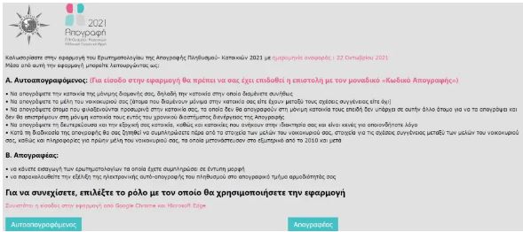 Όσοι δεν έχουν τη δυνατότητα αυτοαπογραφής, θα τους επισκεφθεί ο Απογραφέας της περιοχής τους προκειμένου να τους απογράψει με έντυπο ερωτηματολόγιο, λαμβάνοντας όλα τα μέτρα προστασίας της δημόσιας υγείας.