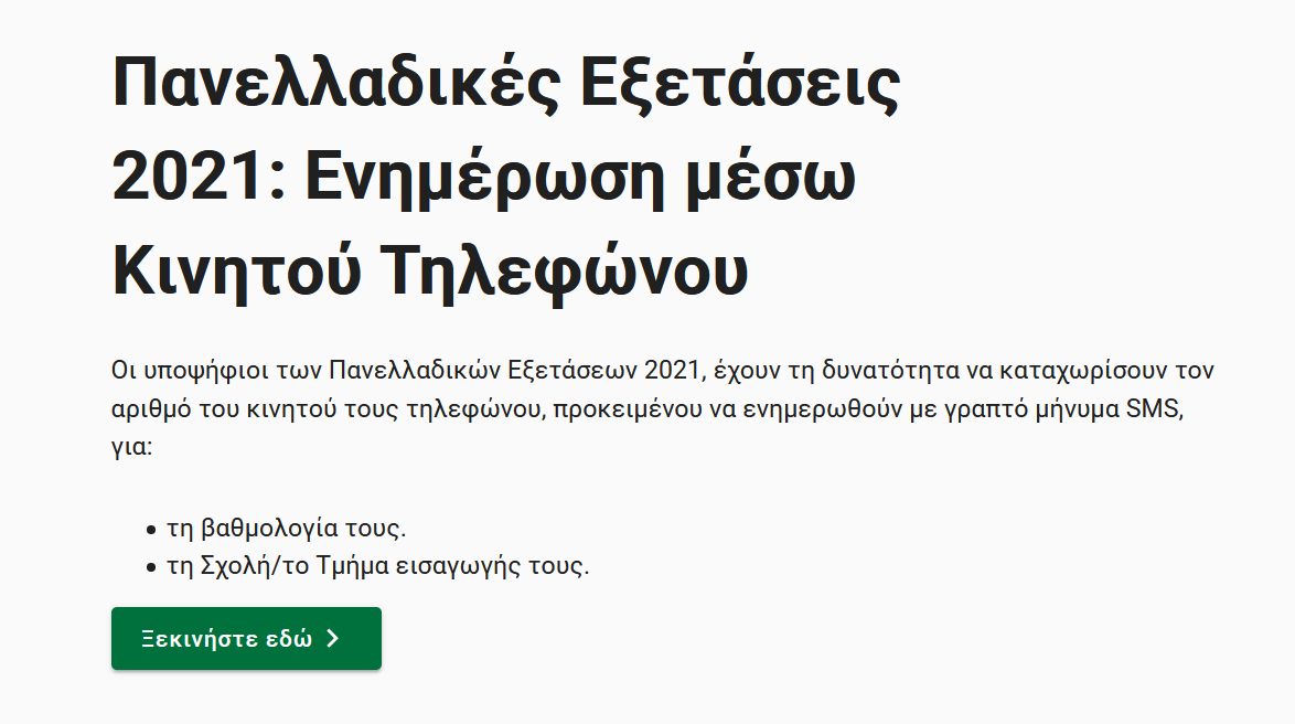 Αποτελέσματα Πανελληνίων 2021 – smsresults.minedu.gov.gr: Με SMS οι υποψήφιοι θα έχουν τη δυνατότητα να ενημερωθούν για τη βαθμολογία τους αλλά και τη σχολή/τμήμα εισαγωγής τους .