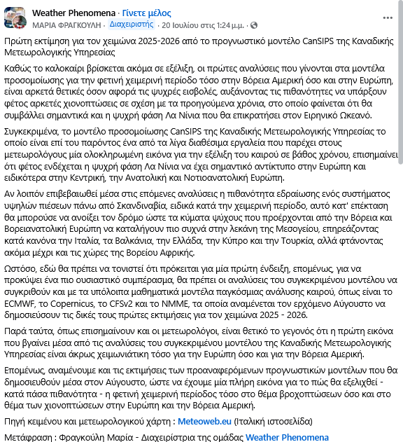 Επομένως, αναμένουμε και τις εκτιμήσεις των προαναφερόμενων προγνωστικών μοντέλων που θα δημοσιευθούν μέσα στον Αύγουστο, ώστε να έχουμε μία πλήρη εικόνα για το πώς θα εξελιχθεί – κατά πάσα πιθανότητα – η φετινή χειμερινή περίοδος τόσο στο θέμα βροχοπτώσεων όσο και στο θέμα των χιονοπτώσεων στην Ευρώπη και την Βόρεια Αμερική.