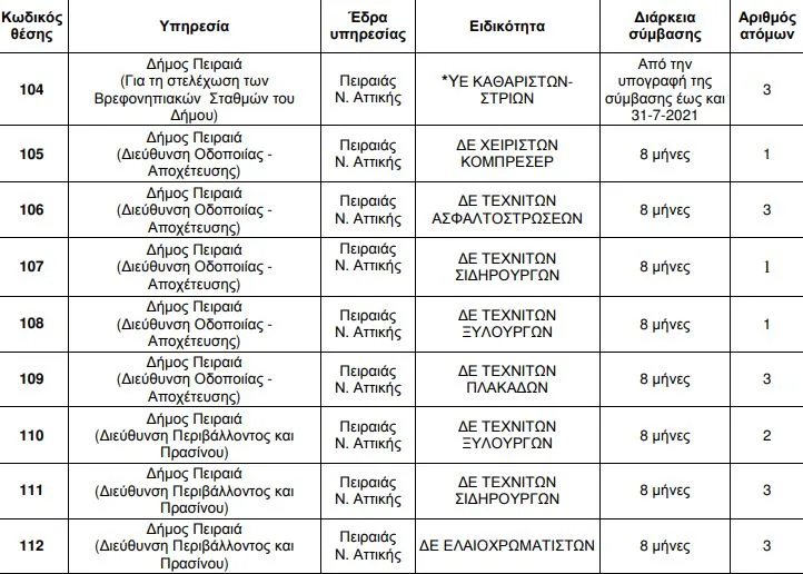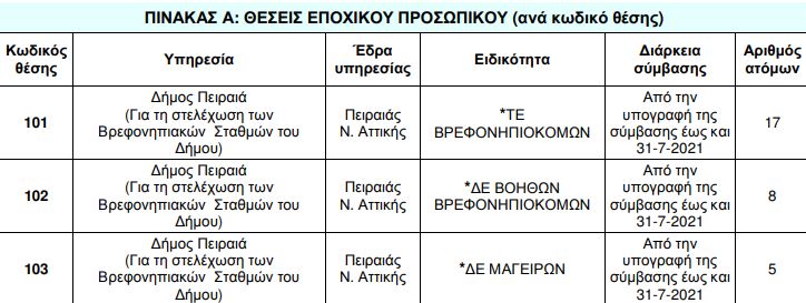 Την πρόσληψη, µε σύµβαση εργασίας ιδιωτικού δικαίου ορισµένου χρόνου, συνολικάπενήντα (50) ατόµων για την κάλυψη εποχικών ή παροδικών αναγκών του ∆ήµου Πειραιά, που εδρεύει στον Πειραιά Ν. Αττικής, και συγκεκριµένα του εξής, ανά υπηρεσία, έδρα, ειδικότητα και διάρκεια σύµβασης, αριθµού ατόµων , µε τα αντίστοιχα απαιτούµενα (τυπικά και τυχόν πρόσθετα).