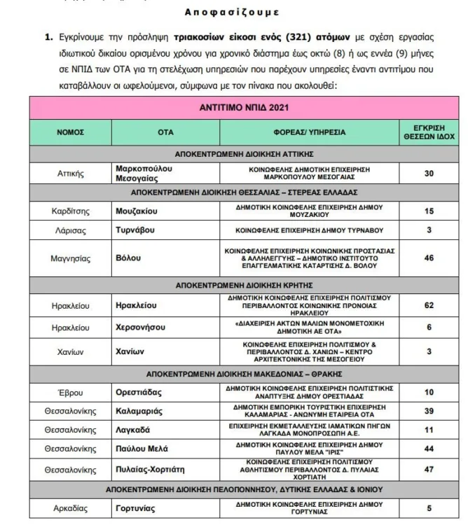 Εγκρίθηκε η πρόσληψη τριακοσίων είκοσι ενός (321) ατόμων, με σχέση εργασίας ιδιωτικού δικαίου ορισμένου χρόνου για χρονικό διάστημα έως οκτώ (8) ή ως εννέα (9) μήνες σε ΝΠΙΔ των ΟΤΑ, για τη στελέχωση υπηρεσιών που παρέχουν υπηρεσίες έναντι αντιτίμου που θα καταβάλλουν οι ωφελούμενοι.