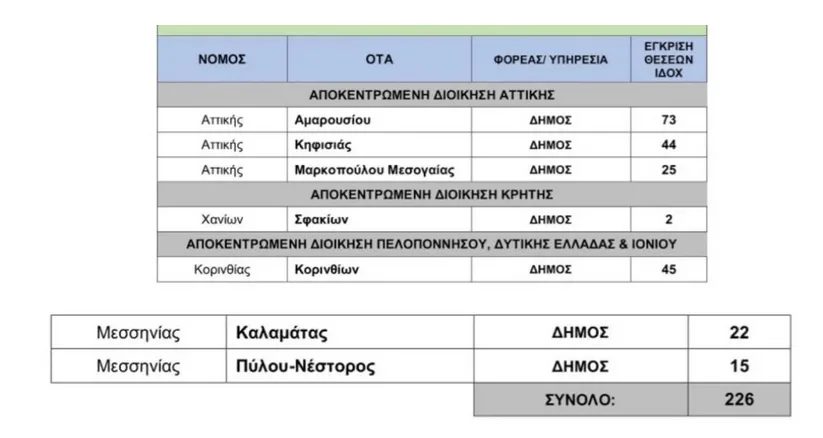 Πιο αναλυτικά, πρόσληψη 226 ατόμων θα γίνει σε συνολικά 7 δήμους μέσω ΑΣΕΠ .