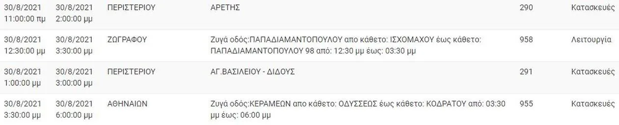 Διακοπές ρεύματος έχει προγραμματίσει για σήμερα, Δευτέρα, 30 Αυγούστου, ο ΔΕΔΔΗΕ, σε αρκετές περιοχές της Αττικής, στις οποίες περιλαμβάνονται το κέντρο της Αθήνας, η περιοχή του Ζωγράφου και το Περιστέρι.