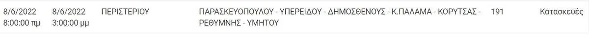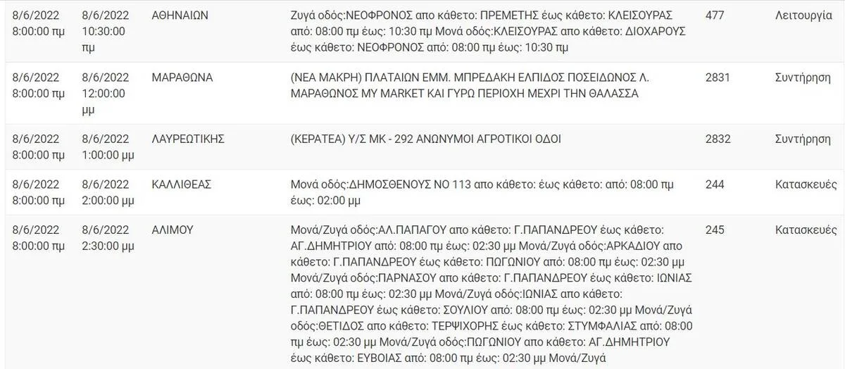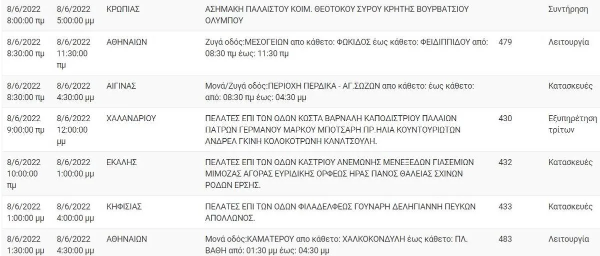 Διακοπή ρεύματος έχουν προγραμματιστεί για σήμερα, Τετάρτη 8 Ιουνίου, σε διάφορες περιοχές της Αττικής όπως το κέντρο της Αθήνας, το Χαλάνδρι και η Κηφισιά. Αναλυτικά οι πίνακες με τις περιοχές: Αθήνα Κηφισιά Εκάλη Χαλάνδρι Αίγινα Κορωπί Περιστέρι Άλιμος Καλλιθέα Λαύριο Μαραθώνας