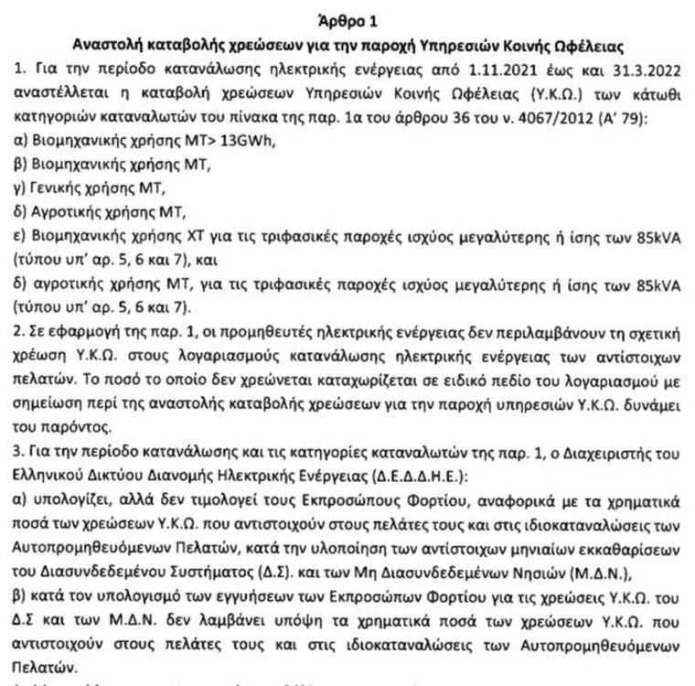 Αναστέλλεται η καταβολή χρεώσεων Υπηρεσιών Κοινής Ωφέλειας (Υ.Κ.Ω.) των μνημονευόμενων κατηγοριών καταναλωτών (βιομηχανικής χρήσης μέσης και χαμηλής τάσης, αγροτικής χρήσης μέσης τάσης κ.λπ.), κατά την περίοδο κατανάλωσης ηλεκτρικής ενέργειας από 1.11.2021 έως και 31.3.2022. Συνακόλουθα, προσδιορίζονται οι ενέργειες των προμηθευτών ηλεκτρικής ενέργειας και του Διαχειριστή του Ελληνικού Δικτύου Διανομής Ηλεκτρικής Ενέργειας (Δ.Ε.Δ.Δ.Η.Ε.), κατά τα ειδικότερα οριζόμενα.