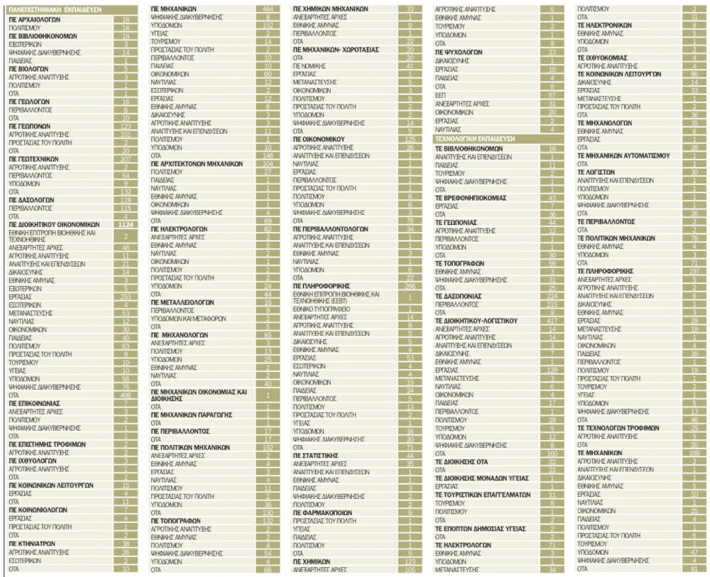 Πιο αναλυτικά, υπενθυμίζουμε σε αυτό το σημείο ότι θα καλυφθούν 3.502 θέσεις Πανεπιστημιακής Εκπαίδευσης, 1.565 κατηγορίας Τεχνολογικής Εκπαίδευσης και 57 Ειδικού Επιστημονικού Προσωπικού, για τις οποίες το ΑΣΕΠ,www.asep.gr, θα εκδώσει προκηρύξεις μετά την ανακοίνωση των αποτελεσμάτων του διαγωνισμού. Επισημαίνεται ότι στις θέσεις ανά υπουργείο περιλαμβάνονται συγκεντρωτικά όλες οι θέσεις στην Κεντρική Υπηρεσία, στις Γενικές και Ειδικές Γραμματείες, στις αποκεντρωμένες – περιφερειακές υπηρεσίες, καθώς και τα ΝΠΔΔ και ΝΠΙΔ που είναι υπό την εποπτεία του κάθε υπουργείου.