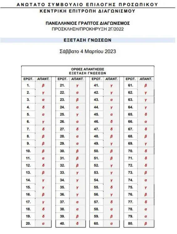 Όπως γίνεται γνωστό, ολοκληρώθηκε η διαδικασία συγκέντρωσης, καταμέτρησης και ταξινόμησης από το Βαθμολογικό Κέντρο του ΑΣΕΠ συνολικά 153.765 απαντητικών φύλλων (στα δύο μαθήματα) που απεστάλησαν από τα 527 εξεταστικά κέντρα στα οποία προσήλθαν οι 76.799 υποψήφιοι το Σάββατο 4 Μαρτίου 2023.