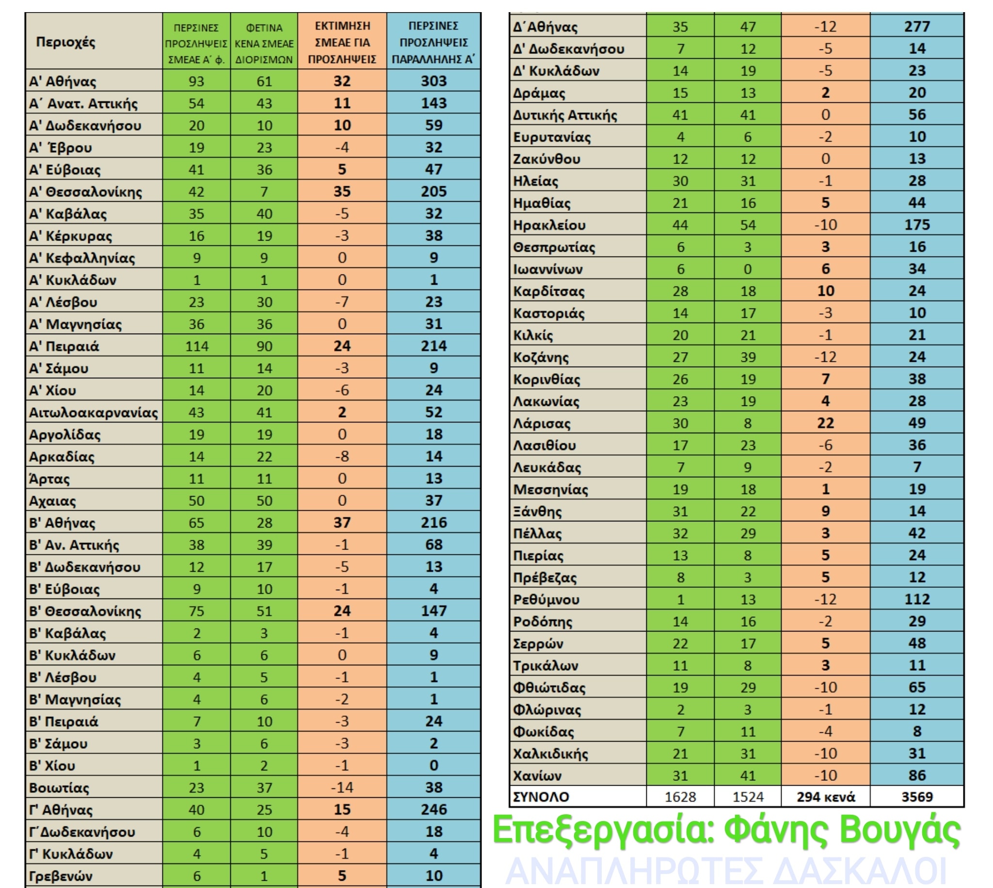 Διορισμοί εκπαιδευτικών: Η σελίδα «Αναπληρωτές Δάσκαλοι» παραθέτει πίνακα του εκπαιδευτικού Φάνη Βουγά με τα κενά της Α΄Φάσης προσλήψεων ανά νομό.