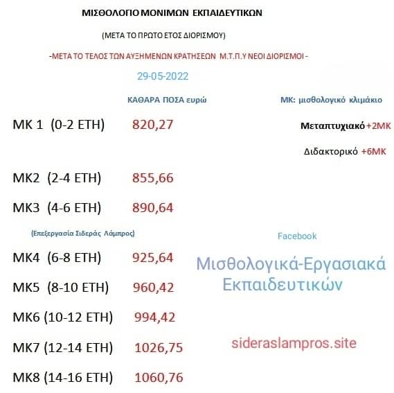 Με επιμέλεια του εκπαιδευτικού Λάμπρου Σιδερά παρατίθεται ακολούθως Πίνακας με το μισθολόγιο των μόνιμων εκπαιδευτικών-ΕΕΠ-ΕΒΠ, μετά το πρώτο έτος διορισμού και μετά το τέλος των αυξημένων κρατήσεων του Μετοχικού Ταμείου Πολιτικών Υπαλλήλων (ΜΤΠΥ).