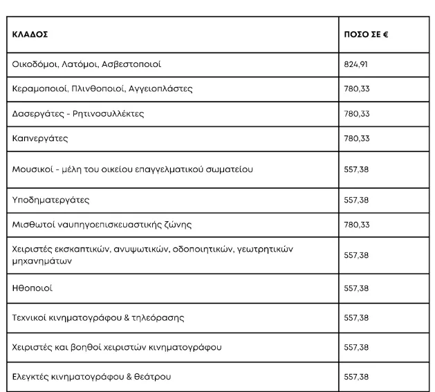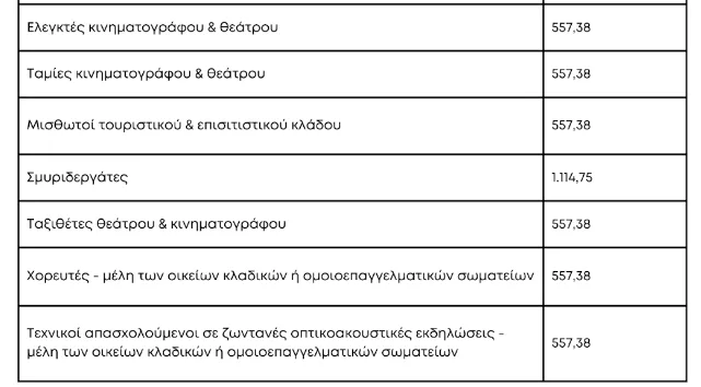 Για τους μουσικούς – τραγουδιστές, ηθοποιούς, υποδηματεργάτες, χειριστές-βοηθούς χειριστών κινηματογράφου, ελεγκτές θεάτρου – κινηματογράφου, ταμίες θεάτρου – κινηματογράφου, τεχνικούς κινηματογράφου και τηλεόρασης, ταξιθέτες θεάτρου – κινηματογράφου, χειριστές εκσκαπτικών ανυψωτικών, οδοποιητικών κλπ μηχανημάτων, μισθωτούς τουριστικού και επισιτιστικού κλάδου, χορευτές – μέλη οικείων κλαδικών ή ομοιοεπαγγελματικών σωματείων, καθώς και τεχνικούς απασχολούμενους σε ζωντανές οπτικοακουστικές εκδηλώσεις – μέλη των οικείων κλαδικών ή ομοιοεπαγγελματικών σωματείων, ορίζεται στο 70% του 25πλασίου του ισχύοντος κατά το χρόνο έναρξης καταβολής του επιδόματος ημερομισθίου ανειδίκευτου εργάτη.
