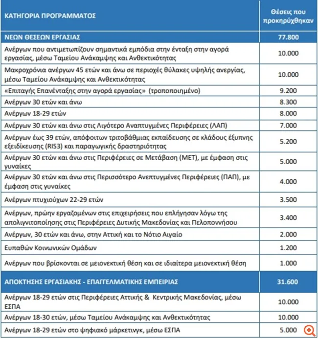 Συνολικά, τα νέα αυτά προγράμματα αφορούν σε 136.719 προκηρυχθείσες νέες θέσεις εργασίας, με τις 12.120 να αφορούν σε προγράμματα επιχειρηματικότητας. Τα ανωτέρω προγράμματα είχαν ως αποτέλεσμα την πρόσληψη2 78.872 ανέργων και την έγκριση 9.455 επιχειρηματικών σχεδίων ή σύσταση νέας επιχείρησης (έναρξη σε Δ.Ο.Υ.), με το συνολικό αριθμό ωφελούμενων να ανέρχεται στους 88.327. Κατά την περίοδο αναφοράς, βρίσκονταν επίσης σε εξέλιξη και 13 προγράμματα Νέων Θέσεων Εργασίας & Απόκτησης Επαγγελματικής Εμπειρίας και 1 πρόγραμμα Νέων Ελεύθερων Επαγγελματιών τα οποία είχαν προκηρυχθεί προηγούμενα έτη.