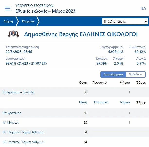 Αυτό είναι το κόμμα που πήρε μόνο μία ψήφο στις εκλογές – Στο 99,61% η ενσωμάτωση των αποτελεσμάτων των εκλογών της 21ης Μαΐου, με τη Νέα Δημοκρατία να έχει επικρατήσει καθαρά 20 μονάδες διαφορά από τον ΣΥΡΙΖΑ και το ΠΑΣΟΚ να ακολουθεί με 11,46%