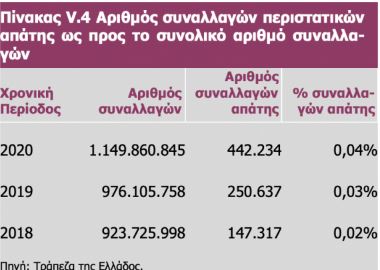 Ανάλογη εξέλιξη αποτυπώθηκε στον αριθμό συναλλαγών απάτης, όπου σημειώθηκε αύξηση κατά 76% σε σχέση με το προηγούμενο έτος. Ο δείκτης της αναλογίας του αριθμού των περιστατικών απάτης προς τον αριθμό των συναλλαγών αυξήθηκε συγκριτικά με το 2019, εξακολούθησε όμως να παραμένει στο χαμηλό επίπεδο του 0,04%, αντιστοιχώντας σε 1 συναλλαγή απάτης ανά 2,6 χιλ. συναλλαγές.