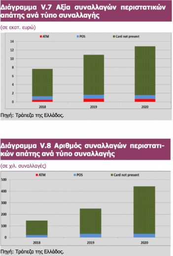 Σε ότι αφορά την χώρα μας, σύμφωνα με τα στοιχεία της ΤτΕ (Εκθεση Χρηματοπιστωτικής Σταθερότητας – Ιουνιος 2021) στα περιστατικά απάτης στις συναλλαγές με κάρτες πληρωμών το 2020 καταγράφηκε αύξηση της αξίας των συναλλαγών απάτης κατά 18% σε σχέση με το 2019. Παρά την αύξηση της αξίας της απάτης, ο δείκτης της αναλογίας της αξίας των περιστατικών απάτης προς την αξία των συναλλαγών εξακολούθησε να διατηρείται στο χαμηλό επίπεδο του 0,02% αντιστοιχώντας σε 1 ευρώ αξία απάτης ανά 5,1 χιλ. ευρώ αξία συναλλαγών.