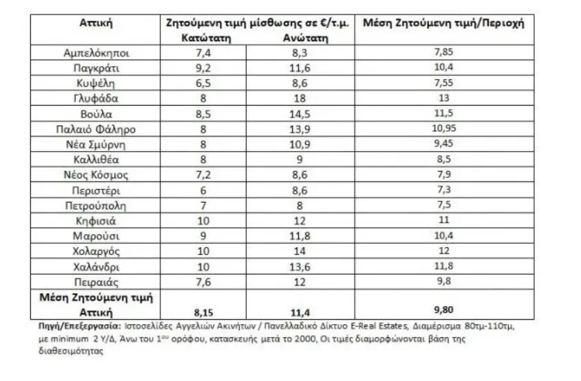 Η μέση κατώτατη ζητούμενη τιμή μίσθωσης στην Αθήνα διαμορφώνεται στα 8,15 €/τ.μ. και η μέση ανώτατη στα 11,4 €/τ.μ., δηλαδή, μια οικογένεια θα πρέπει να καταβάλει μόνο για το ενοίκιο από 815€/μήνα έως και 1.140€/μήνα αν πρόκειται για κατοικία 100τμ.