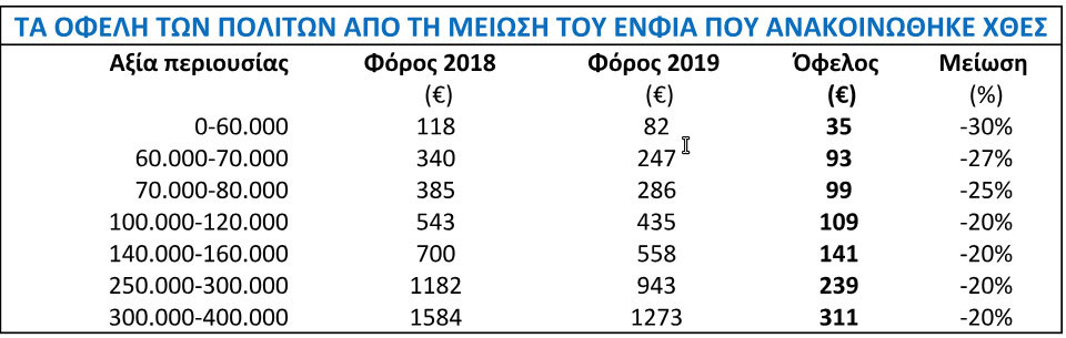 Πρόκειται για ένα μέτρο που θα δώσει μεγάλη ανάσα σε χιλιάδες νοικοκυριά με τους μικροϊδιοκτήτες να είναι αυτοί που θα ωφεληθούν περισσότερο καθώς η μείωση θα αγγίξει το 30%. H μεσαία τάξη θα δει σημαντική μείωση της τάξης του 20%. Οι πολλοί λίγοι (περίπου 15.000 ιδιοκτήτες) που έχουν ακίνητη περιουσία άνω του 1 εκατ.ευρώ θα δουν τον ΕΝΦΙΑ μειωμένο κατά 10%. Αυτό σημαίνει πως οι ιδιοκτήτες ακινήτων θα έχουν όφελος από 35 έως και 311 ευρώ.