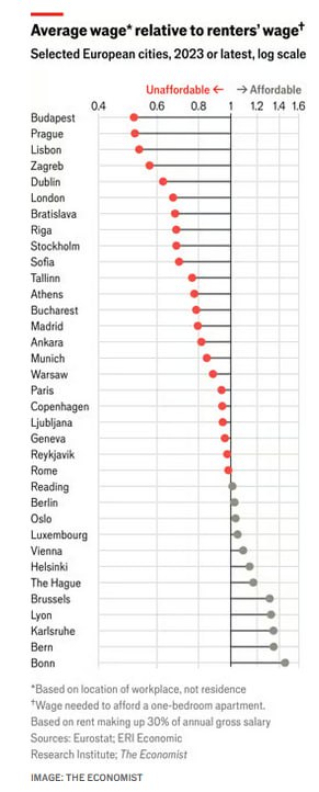 Αλλά τα εισοδήματα ποικίλλουν σημαντικά σε ολόκληρη την ήπειρο. Για να μάθει ο Economist πού βρίσκεται ένα διαμέρισμα ενός υπνοδωματίου προσβάσιμο για τον μέσο εισοδηματία, ανέπτυξε τη «βαθμολογία Bradshaw». Αυτό συγκρίνει τον συνιστώμενο μισθό των ενοικιαστών με τον μέσο μισθό σε κάθε πόλη, χρησιμοποιώντας δεδομένα από το Ινστιτούτο Οικονομικών Ερευνών ERI, έναν αθροιστή αμοιβών. Όσο υψηλότερη είναι η βαθμολογία, τόσο πιο προσιτό είναι να νοικιάσετε μόνοι σας.