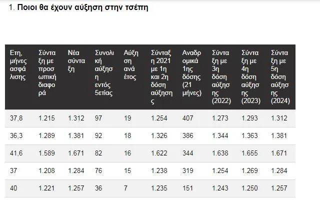 Οι παλαιοί συνταξιούχοι προ νόμου Κατρούγκαλου με 30 έτη ασφάλισης και άνω θα έχουν νέο επανυπολογισμό σύνταξης και αυξήσεις σε 5 ετήσιες δόσεις, εφόσον ξεπεράσουν το ποσό που λαμβάνουν τώρα ως προσωπική διαφορά. Η πρώτη και δεύτερη δόση της αύξησης (για 2020 και 2021) θα πληρωθούν μαζί μετά τον Ιούνιο. Τα δε αναδρομικά θα είναι από την πρώτη δόση και θα φτάνουν στους 21 μήνες με πληρωμή μετά τις αυξήσεις. Για παράδειγμα, συνταξιούχος που θα έχει αύξηση 100 ευρώ (αφού μηδενίσει την προσωπική διαφορά) θα πάρει μετά τον Ιούνιο δύο δόσεις (2/5) της αύξησης, που θα είναι 40 ευρώ στη σύνταξη και αναδρομικά 21 μηνών από την πρώτη δόση αύξησης των 20 ευρώ, δηλαδή 420 ευρώ. Το 2022 θα πληρωθεί την 3η δόση της αύξησης και τα έτη 2023 και 2024 την 4η και 5η δόση αντίστοιχα, οπότε τα 100 ευρώ θα έχουν πληρωθεί στο σύνολό τους.