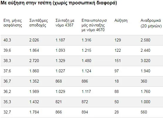 - Συνταξιούχος ΔΕΚΟ που αποχώρησε το 2016 με 38,3 έτη ασφάλισης και συντάξιμες αποδοχές 2.720 ευρώ παίρνει σύνταξη 1.329 ευρώ. Στον επανυπολογισμό η σύνταξη θα βγει στα 1.480 ευρώ, με αύξηση 151 ευρώ και αναδρομικά 20μήνου 3.020 ευρώ.