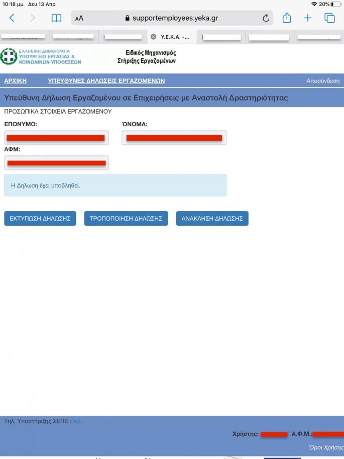 Δεν ήταν λίγοι επίσης όσοι δεν αντιλήφθηκαν πως δεν είχαν στην πραγματικότητα ολοκληρώσει την υποβολή της δήλωσης, καθώς σε ορισμένες περιπτώσεις απαιτούνταν η επανυποβολή της αρκετές φορές για να την “πάρει” το σύστημα. Σε κάθε περίπτωση για να είναι σίγουρος ο εργαζόμενος – χρήστης πως η δήλωσή του έχει υποβληθεί και θα λάβει τα 800 ευρώ πρέπει να δει στην οθόνη του το μύνημα “Η δήλωση έχει υποβληθεί” με το επώνυμο, όνομα και το ΑΦΜ του.