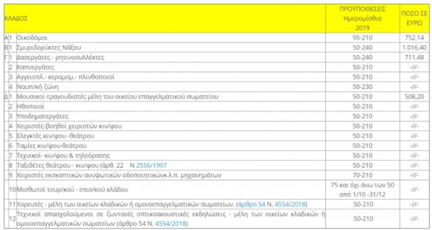 για τα επαγγέλματα των μουσικών – τραγουδιστών, ηθοποιών, υποδηματεργατών, χειριστών-βοηθών χειριστών κιν/φου, ελεγκτών θεάτρου – κιν/φου, ταμιών κιν/φου – θεάτρου, τεχνικών κιν/φου & τηλεόρασης, ταξιθετών θεάτρου – κιν/φου, χειριστών εκσκαπτικών ανυψωτικών οδοποιητικών κλπ μηχανημάτων και μισθωτών τουριστικού και επισιτιστικού κλάδου, χορευτών – μέλη των οικείων κλαδικών ή ομοιοεπαγγελματικών σωματείων, καθώς και των τεχνικών απασχολούμενών σε ζωντανές οπτικοακουστικές εκδηλώσεις – μέλη των οικείων κλαδικών ή ομοιοεπαγγελματικών σωματείων, ορίζεται στο 70% του 25πλασίου του εκάστοτε ισχύοντος ημερομισθίου ανειδίκευτου εργάτη.