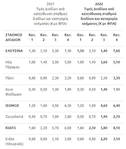 Τα νέα τέλη παρουσιάζονται αναλυτικά ανά αυτοκινητόδρομο, σταθμό διοδίων και κατηγορία οχήματος στους παρακάτω πίνακες. Με κόκκινο χρώμα παρουσιάζονται οι τιμές που έχουν αυξήσεις από 0.05€ έως 0.30€ και με μαύρο χρώμα, παρουσιάζονται οι τιμές που παραμένουν αμετάβλητες σε σύγκριση με το 2021.