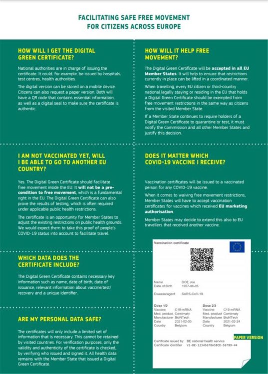 Το εκτελεστικό όργανο της ΕΕ αποφάσισε να δεχθεί την ιδέα ενός πιστοποιητικού εμβολιασμού καθώς η αδυναμία των κρατών – μελών να εναρμονίσουν τις πολιτικές τους για τους περιορισμούς που επέβαλαν στα εσωτερικά σύνορα της ΕΕ ανάγκασε την Ευρωπαϊκή Επιτροπή να μην εκδώσει απλώς μία σύσταση αλλά να υποβάλει κανονισμό. Δηλαδή μια δεσμευτική νομοθετική πράξη η οποία όταν και εφόσον εγκριθεί από τα δύο νομοθετικά όργανα της ΕΕ, ήτοι Συμβούλιο και Ευρωπαϊκό Κοινοβούλιο, θα εφαρμόζεται υποχρεωτικά σε όλα τα κράτη – μέλη της ΕΕ.