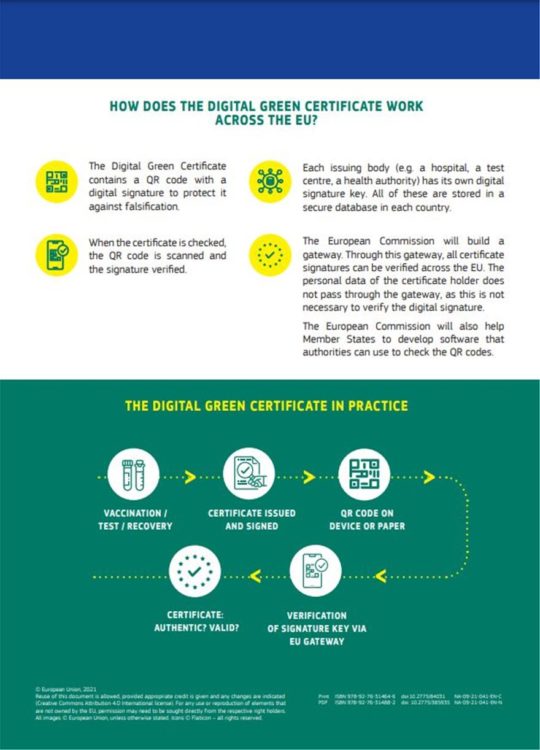 Το εν λόγω έγγραφο θα καλύπτει τρία είδη πιστοποιητικών. Πρώτον ένα πιστοποιητικό εμβολιασμού όπου θα αναγράφεται ο τύπος του εμβολίου και ο φορέας που χορήγησε το εμβόλιο. Δεύτερον πιστοποιητικά εξέτασης (δοκιμασία NAAT/RT-PCR ή ταχεία δοκιμασία αντιγόνου) και πιστοποιητικά για άτομα που έχουν αναρρώσει από την COVID-19. Στην τρίτη περίπτωση το πιστοποιητικό θα έχει διάρκεια 180 ημερών εκτός εάν τα επιστημονικά δεδομένα μεταβληθούν. Παράλληλα θα εναπόκειται στα κράτη – μέλη της ΕΕ να ορίσουν για πόσον καιρό θα θεωρείται έγκυρο ένα αρνητικό διαγνωστικό τεστ στο οποίο υπεβλήθη ένας ταξιδιώτης.