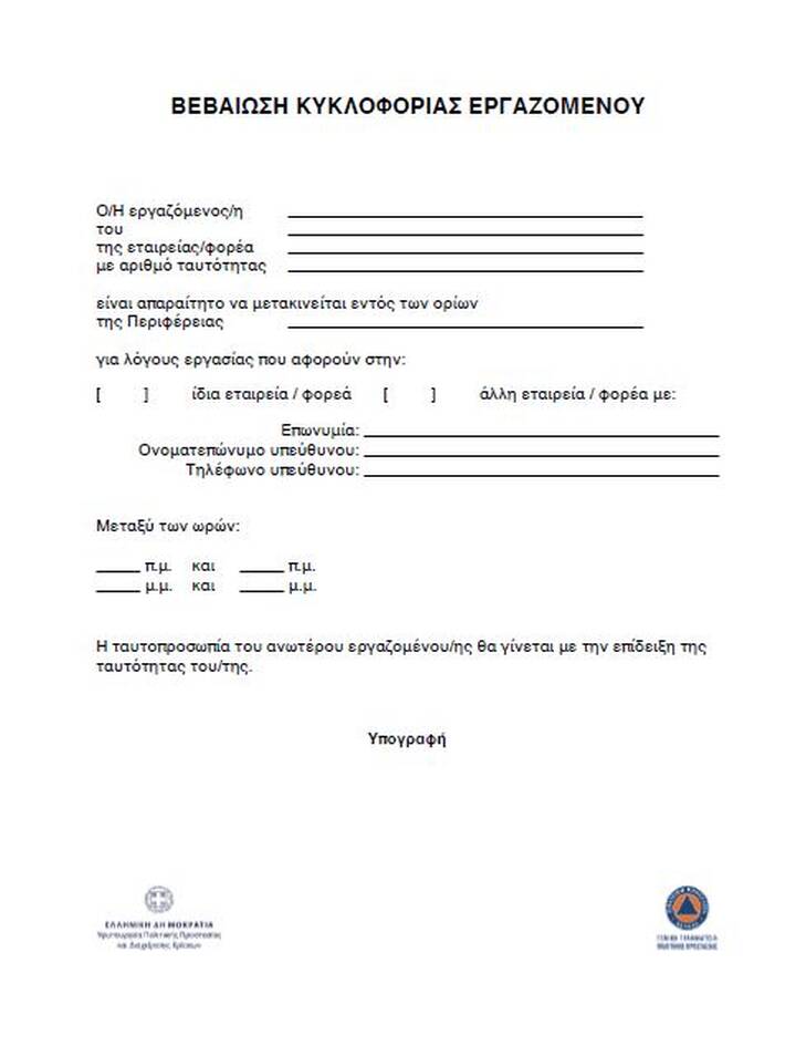 Σε περίπτωση που είναι απολύτως αναγκαία η μετακίνηση εργαζομένου εκτός έδρας θα πρέπει να φέρει μαζί του δύο βεβαιώσεις (Βεβαίωση τύπου Α’ και Βεβαίωση τύπου Β’).