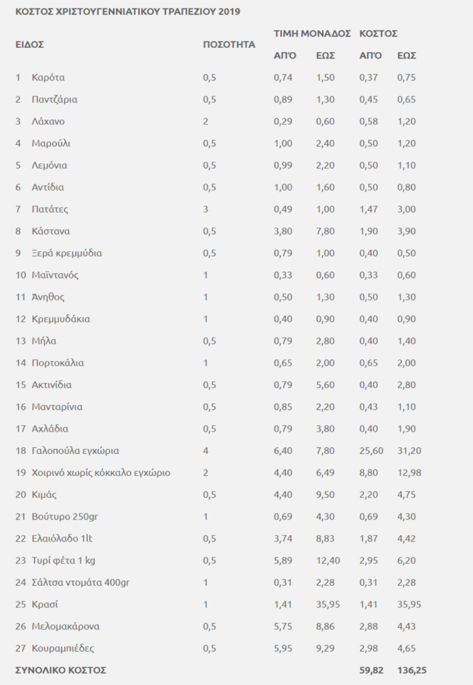Μέχρι και κατά 127,7% ακριβότερα μπορεί να στοιχίσουν τα ίδια ακριβώς προϊόντα και στις ίδιες ποσότητες για το φετινό γιορτινό τραπέζι, καθώς η κατώτερη και ανώτερη τιμή των ίδιων ειδών διαφέρουν πολύ ανά σημείο πώλησης, όπως επισημαίνει το Κέντρο Προστασίας Καταναλωτών (ΚΕΠΚΑ), επισημαίνοντας ότι οι καταναλωτές θα πρέπει και φέτος να κάνουν πολύ προσεκτική έρευνα αγοράς.