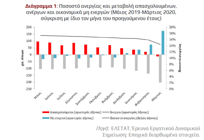 Το Ινστιτούτο Εργασίας της ΓΣΕΕ έδωσε χθες στη δημοσιότητα το 6ο Δελτίο Οικονομικών Εξελίξεων, το οποίο εστιάζει στις πιθανές εξελίξεις στην αγορά εργασίας λόγω της πανδημίας του κορωνοιού. Σύμφωνα με το ΙΝΕ/ΓΣΕΕ, η απασχόληση μειώνεται σταδιακά, κυρίως μετά τον Νοέμβριο του 2019, ενώ η αύξηση των οικονομικά μη ενεργών έχει ως αφετηρία τον Δεκέμβριο του 2019. Τους πρώτους δύο μήνες του 2020, πριν από το ξέσπασμα της πανδημίας, ο αριθμός των οικονομικά μη ενεργών αυξήθηκε κατά περίπου 102.000 άτομα, ενώ μόνο τον Μάρτιο του ίδιου έτους σημειώθηκε αύξηση της τάξης των 173.000 ατόμων. Όπως επισημαίνει το ΙΝΕ/ΓΣΕΕ, η κατάσταση στην αγορά εργασίας είχε αρχίσει να επιδεινώνεται από το τελευταίο τρίμηνο του 2019, ενώ η εκδήλωση της υγειονομικής κρίσης φαίνεται να οδηγεί σε περαιτέρω επιδείνωση εντείνοντας την επισφάλεια και την αβεβαιότητα των εργαζομένων.