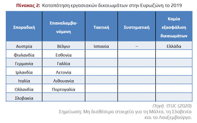 Σημαντική είναι και η απόκλιση της Ελλάδας ως προς την προστασία των εργασιακών δικαιωμάτων, καθώς βρίσκεται στην 63η θέση στην παγκόσμια κατάταξη όσον αφορά στην καταπάτηση των εργασιακών δικαιωμάτων.
