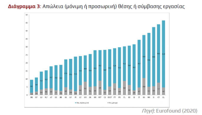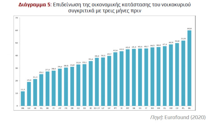 Σύμφωνα με την έρευνα του Eurofound, στην Ελλάδα το 46,5% δήλωσε ότι απώλεσε είτε μόνιμα είτε προσωρινά τη θέση εργασίας του. Η εξέλιξη αυτή οδήγησε και σε σημαντική πτώση του όγκου της απασχόλησης σε ώρες εργασίας, με το 66,2% των εργαζομένων στη χώρα να βιώνει μικρή ή μεγάλη μείωση στον χρόνο απασχόλησης, έναντι 49,5% στην ΕΕ-27. Οι μισοί ερωτηθέντες (47,4%) στην Ελλάδα απάντησαν ότι τους τελευταίους τρεις μήνες επιδεινώθηκε η οικονομική τους κατάσταση. Το ποσοστό αυτό αντιπροσωπεύει την 5η υψηλότερη επίδοση μεταξύ των υπό εξέταση ευρωπαϊκών χωρών και είναι 9,2 μονάδες υψηλότερο από τον μέσο όρο της ΕΕ-27.
