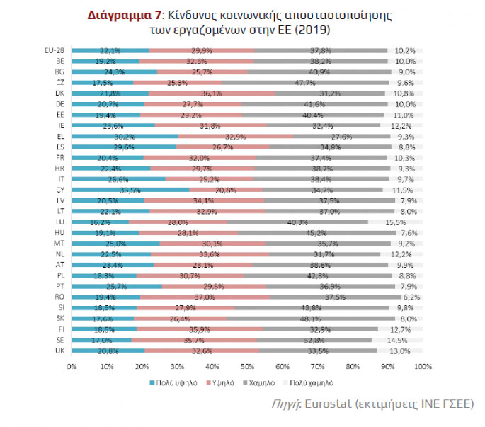 Το μεγαλύτερο ποσοστό απασχόλησης που βρίσκεται σε πολύ υψηλό επίπεδο κινδύνου εντοπίζεται σε δύο νησιωτικές περιφέρειες με πολύ ισχυρή τουριστική ζήτηση, στο Νότιο Αιγαίο με 49,7% και στα Ιόνια Νησιά με 45,2%.