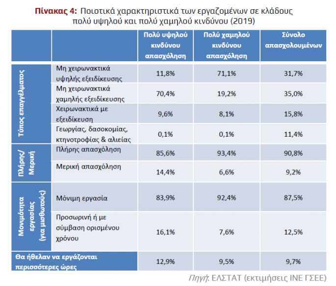 Από τα ποιοτικά χαρακτηριστικά των εργαζομένων που απασχολούνται σε κλάδους πολύ υψηλού κινδύνου προκύπτει ότι ένα μεγάλο ποσοστό εντοπίζεται σε επισφαλή επαγγέλματα με χαμηλό επίπεδο ειδίκευσης που συνήθως έχουν και χαμηλές μισθολογικές απολαβές. Αυτό υποδεικνύει ότι οι οικονομικές επιπτώσεις της πανδημίας θα είναι ανισοβαρείς μεταξύ κοινωνικών ομάδων, ενώ αναμένεται να οξύνουν περαιτέρω τις εισοδηματικές ανισότητες και τον κατακερματισμό της αγοράς εργασίας.