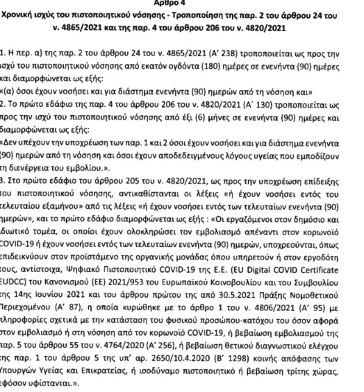Το πρωί της Πέμπτης το φως της δημοσιότητας είδε η τροπολογία που κατήρτησε η κυβέρνηση και τίθεται προς ψήφιση όπου σε αυτήν αναφέρεται πως το πιστοποιητικό νόσησης θα έχει ισχύ πλέον 90 μέρες. Αξίζει να διευκρινιστεί πάντως πως μετά το πέρας της ισχύος, θα υπάρχει περιθώριο ένας μήνας προκειμένου ο πολίτης να εμβολιαστεί και να λάβει πιστοποιητικό εμβολιασμού.