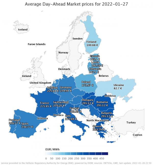 Με την τιμή στα 293,79 ευρώ/MWh, η άνοδος είναι 42% σε σχέση με τις 22 Ιανουαρίου, που ήταν 206,46 ευρώ/MWh.